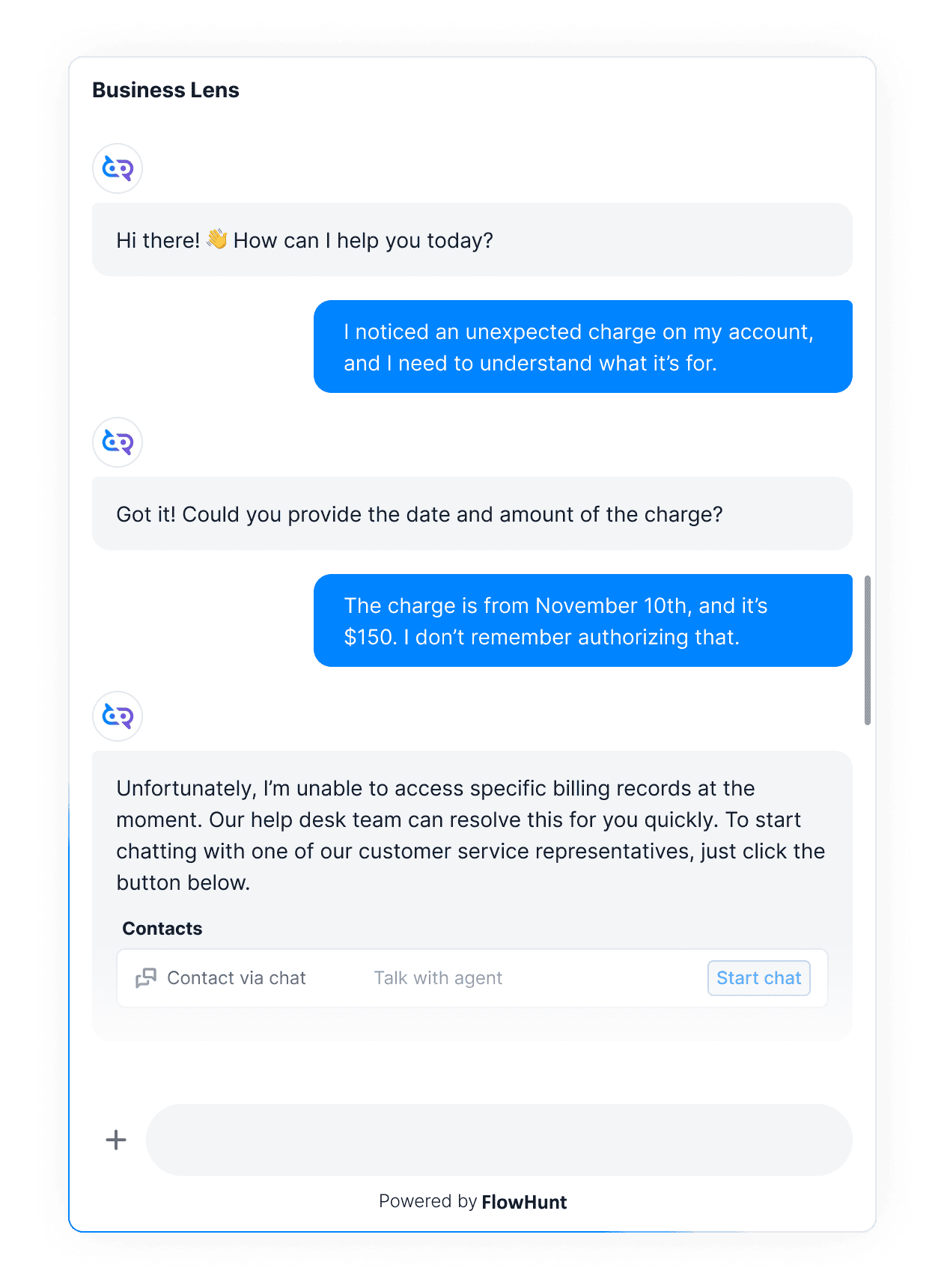 Sin importar el idioma o la situación, FlowHunt te da respuestas actualizadas, se conecta con tu software de atención al cliente y se adapta a tu marca.
