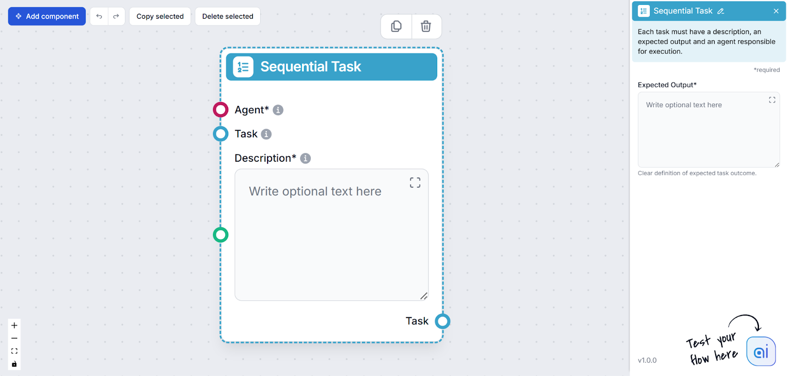 The task components allow you to give specific tasks to AI agents. Think of AI agents as additional team members for a moment. Each member has a different role, backstory, and goals. Just like a real team member, they are qualified to carry out many various tasks. Thanks to this component, you can specify and assign these tasks.