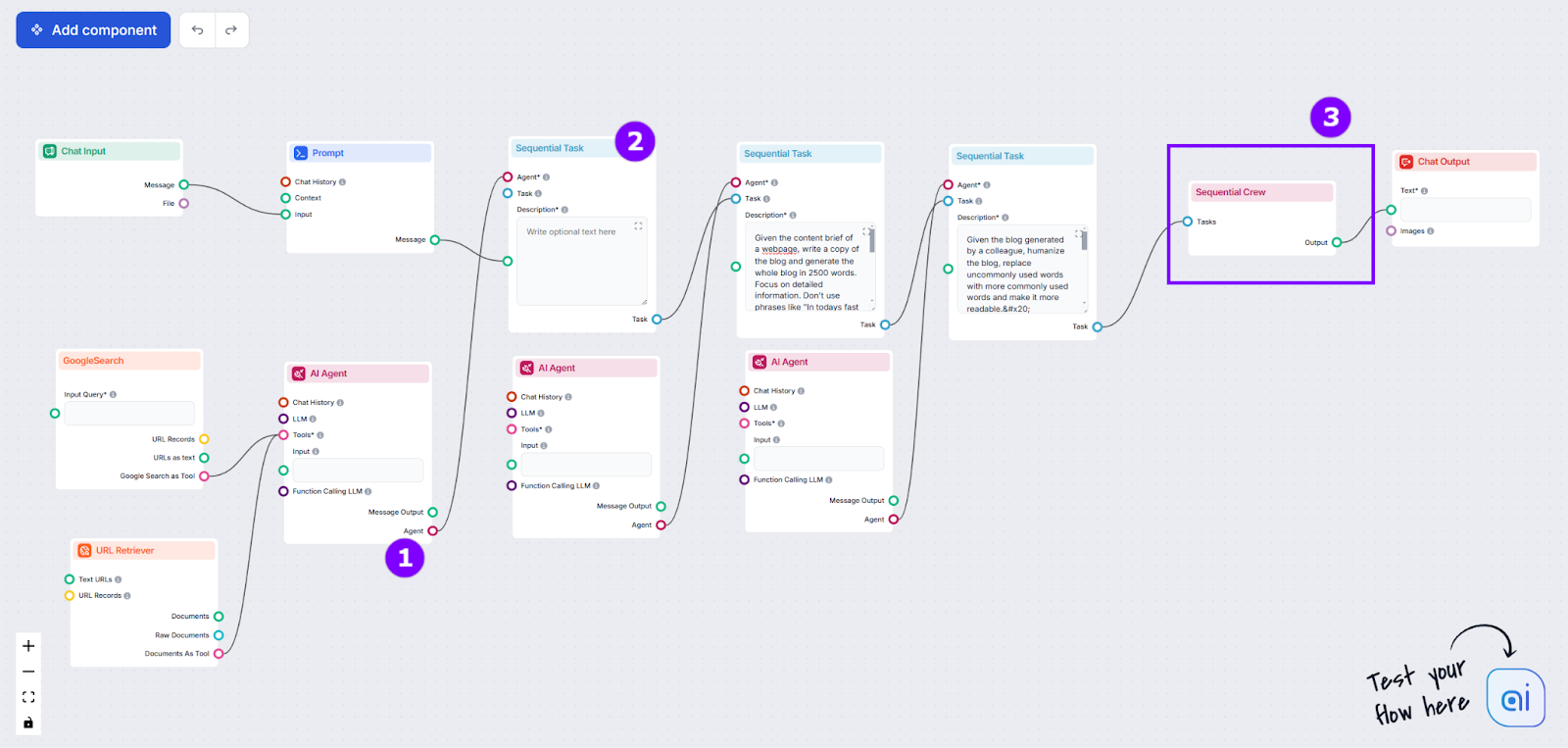 Take the Sequential Task component and connect it to the agent performing the task. Below, you can see several agents, each connected to their task: